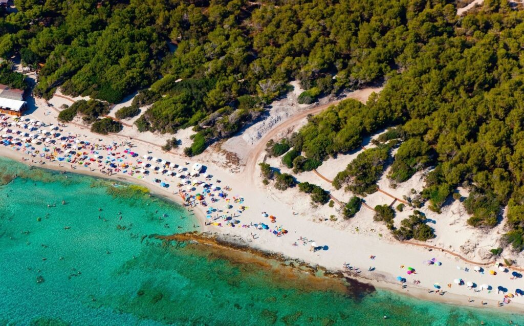 Continúa hacia la playa de Las Salinas, una playa en forma de media luna rodeada de pinares de arena blanca y suave, aguas cristalinas y chiringuitos con ambiente vibrante. Las Salinas lleva toda la vida siendo la playa estrella de la isla de Ibiza por su belleza natural y su ambiente animado gracias a los chiringuitos, sus dj’s y el desfile continuo de apuestos chicos y chicas promocionando las fiestas de la isla. Si buscas un ambiente de playa animado y auténtico en Ibiza, Las Salinas es sin duda el mejor plan para pasar un día de verano. Por la tarde, también podrás disfrutar de una puesta de sol espectacular desde alguno de sus miradores elevados con vistas panorámicas a las salineras y el mar, viendo a su vez los aviones aterrizar en la isla de Ibiza.